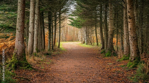 Fototapeta premium A winter forest path lined with evergreen trees, creating a peaceful walk...