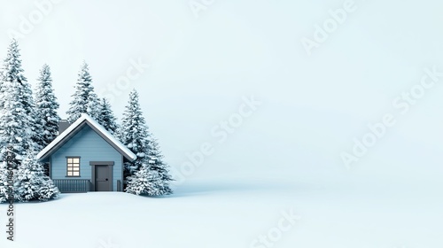 © lililia, Naklejka premium A winter house stands peacefully in a snowy landscape, framed by tall evergreen trees set against a soft pastel backdrop