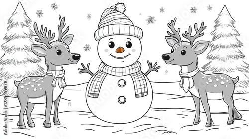 Naklejka premium A winter illustration coloring page with a cute snowman and reindeer friends.
