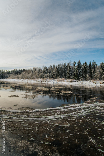 © indars18, Fototapeta premium A winter landscape with a river with ice floes and a clear blue sky with snow-covered trees.