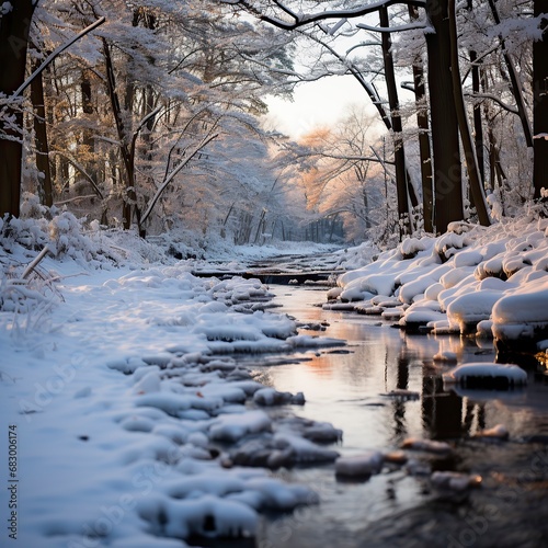 Fototapeta premium A winter morning in a forest with sunlight filtering throu ,Winter...
