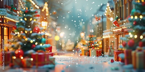 Fototapeta premium A winter scene with colorful presents and decorations on a city street