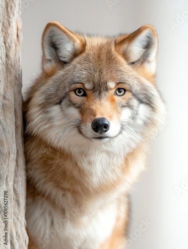 © S.JR Stocker, Fototapeta premium a winter wolf with thick gray and white fur, isolated on a solid light beige background,