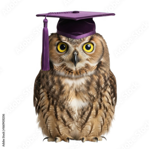 © MstShilpi12, Naklejka premium A wise and adorable great horned owl wearing a purple graduation cap symbolizing knowledge and academic achievement isolated on transparent background
