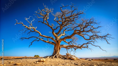 Fototapeta premium A withered, barren, dry branch tree stands solitary, its gnarled limbs stretched towards a desolate, cloudless blue sky backdrop.