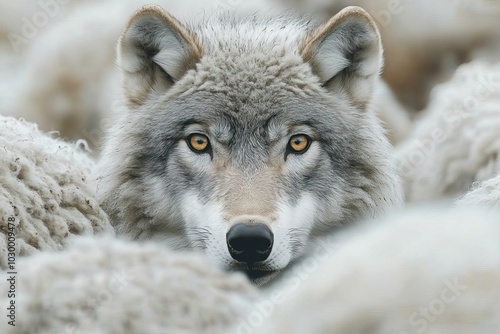 © Lina, Fototapeta premium A wolf camouflages among sheep.