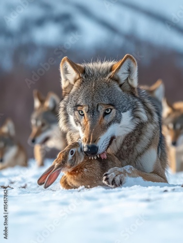 Fototapeta premium A wolf captures a rabbit in a snowy landscape, surrounded by other wolves in...
