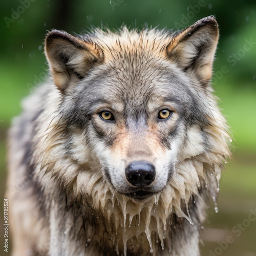 © cff999, Fototapeta premium a wolf is standing in the rain