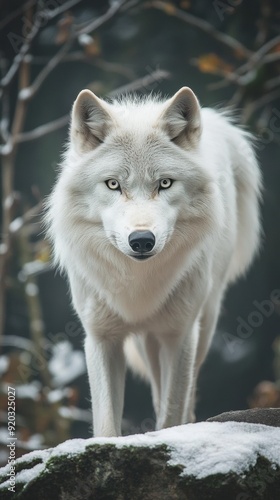 © Oulailux, Obraz premium A wolf is standing on a rock in the snow