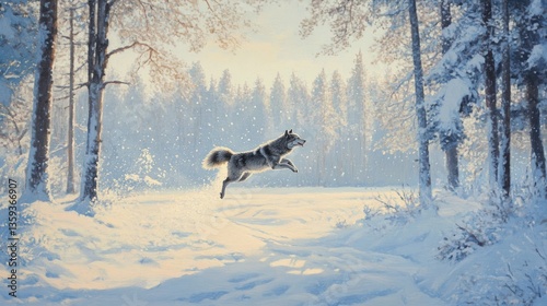 © yuan, Obraz premium A wolf leaps through a snowy forest, capturing the essence of winter's beauty and wildlife.