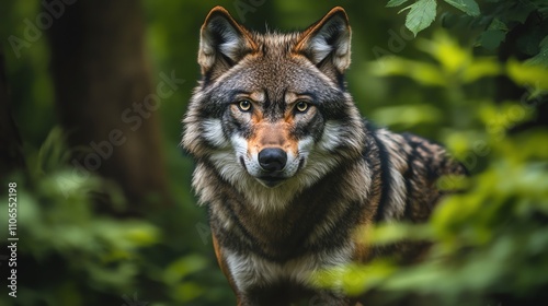 Naklejka premium A wolf looks directly at the camera from inside a green forest.