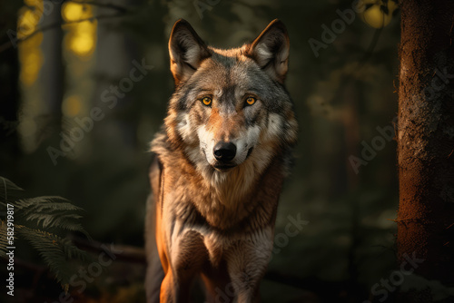 © DarkKnight, Fototapeta premium A wolf on forest mountain looking at camera, Ai Generative