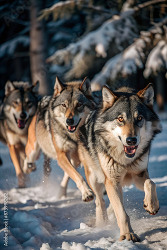 © Big, Naklejka premium a wolf pack running through a snowy forest