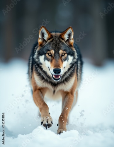© Oleg, Naklejka premium A wolf running through the snow in the woods