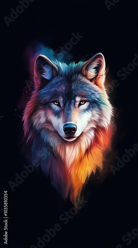 © Ilona, Naklejka premium A wolf's face in close-up against a black backdrop, eyes gleaming with their distinctive hues