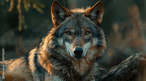 © Olga, Obraz premium a wolf's face with trees in sharp focus behind