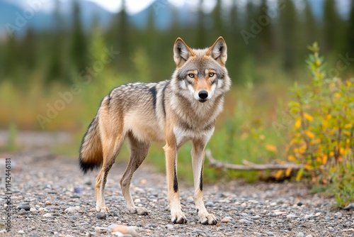 © Thanyarat, Fototapeta premium A wolf standing in a forest clearing, with its piercing eyes and majestic stance creating a sense of wilderness