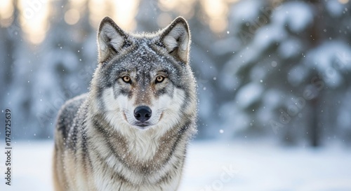 © Nany, Fototapeta premium A wolf standing in a snowy forest. The animal concept of a wild predator.
