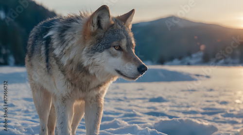 © Masum, Fototapeta premium a wolf standing in the snow with the sun setting