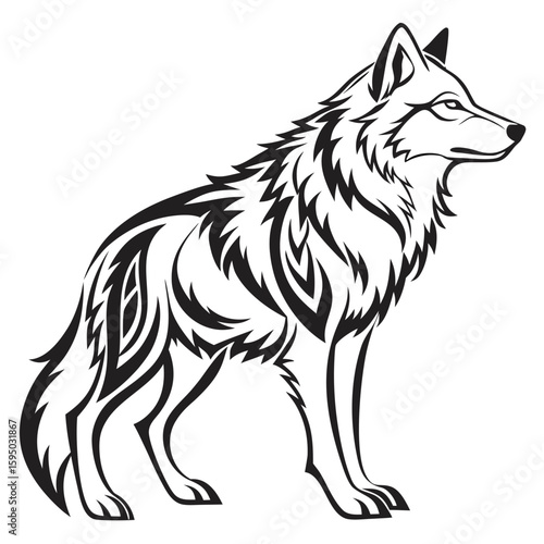Obraz premium A wolf stands alert, looking to the side