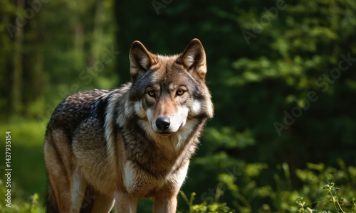 © Luna, Obraz premium A wolf stands alone in the middle of a dense forest, surrounded by tall trees