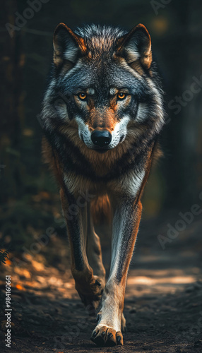 © fadi, Obraz premium A wolf stands and stares at the cold forest.