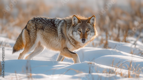 Naklejka premium A wolf walking through a snowy landscape with golden backlighting.