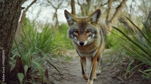 Naklejka premium A wolf walks along a dirt path in a forest, surrounded by trees and foliage