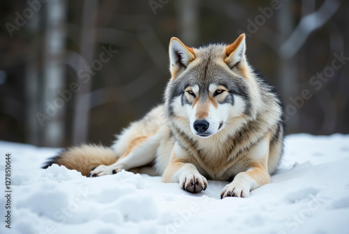 © Limanou Mikael, Naklejka premium A wolf with a stern expression rests in the snow.