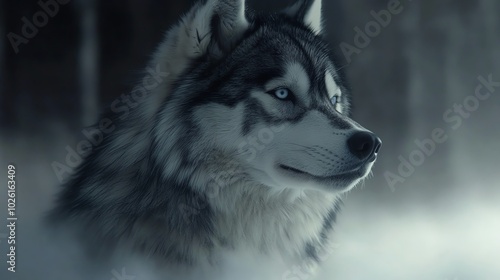 Naklejka premium A wolf with piercing blue eyes stands in a misty forest, its fur blending with the shadows.