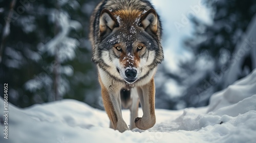 Naklejka premium A wolf with snow on its fur walks through a snowy forest.