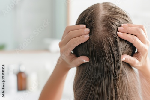 Fototapeta premium A woman adjusting her wet hair after showering, with a focus on the back of her head, showing hair care in a bathroom setting.