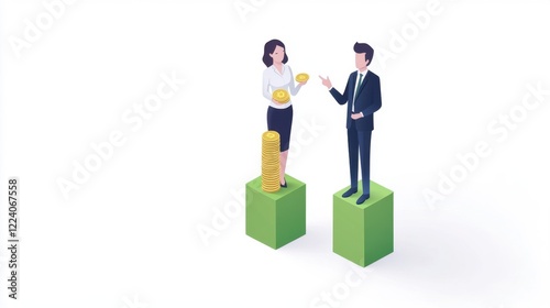 © mangolovemom, Obraz premium A woman and a man stand on green blocks, representing financial growth, with the woman holding coins and the man gesturing confidently.
