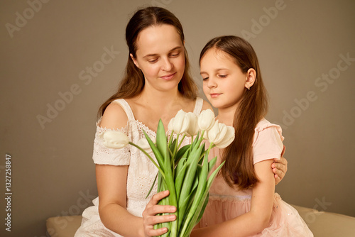 © sementsova321, Obraz premium A woman and a young girl sit closely together, gazing at a bouquet of white tulips. The soft lighting enhances their warm expressions and the intimate atmosphere of the room