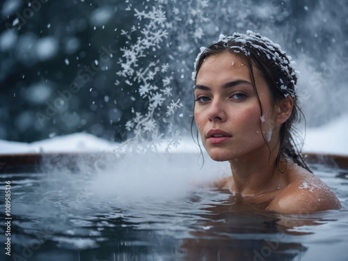 © Leopard, Fototapeta premium A woman bathing in a wooden tub outdoors in the cold, surrounded by snowy mountains, creating a unique contrast of warmth and winter's chill