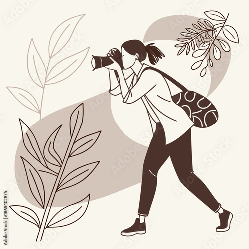 © Lubna, Fototapeta premium A woman captures the beauty of nature through her camera lens while walking outdoors