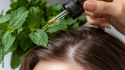 Obraz premium 40.A woman carefully applying peppermint essential oil to her scalp using a dropper, with emphasis on the natural treatment of female pattern baldness. The vibrant green mint leaves nearby highlight