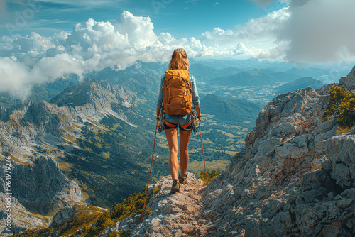 © Sebastian, Obraz premium A woman climbing a mountain trail alone, enjoying the solitude and challenge. Concept of physical independence and personal growth.