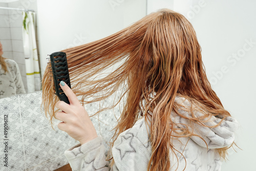 Naklejka premium A woman combs her wet tangled hair after a bath. View from the back