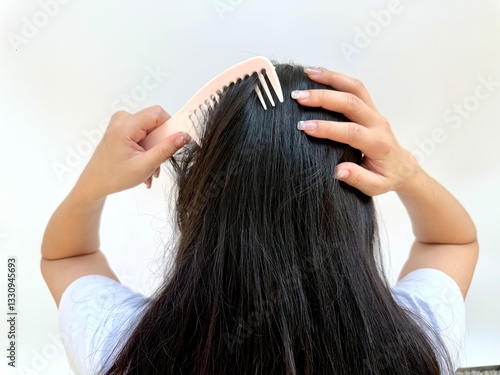 © suppachai, Naklejka premium A woman delicately detangles her hair using a wooden comb, focusing on scalp care, hydration, frizz reduction, and maintaining a sleek, polished, and tangle-free look with volume.