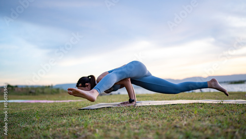© WARAPHON, Fototapeta premium A woman doing yoga on a grassy field