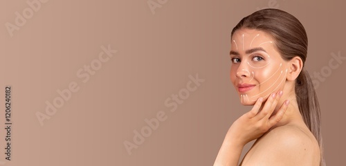 © Prostock-studio, Obraz premium A woman engages in a skin care routine, applying pampering products on her face. She exudes calmness and confidence while surrounded by an empty, neutral background.