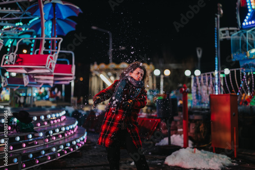 © qunica.com, Obraz premium A woman enjoying herself on a snowy night at a brightly lit amusement park. The scene captures her playful and joyful mood alongside the festive colors of the winter season.