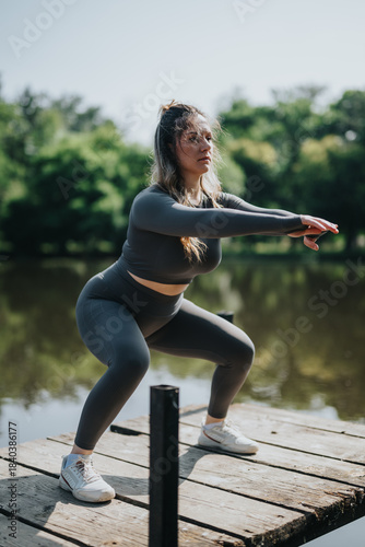 Fototapeta premium A woman exercises outdoors, performing squats on a wooden dock near a serene...