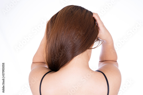© saran, Fototapeta premium A woman feeling exhausted and suffering from neck and head pain and injury on isolated white background. Health care and medical concept.