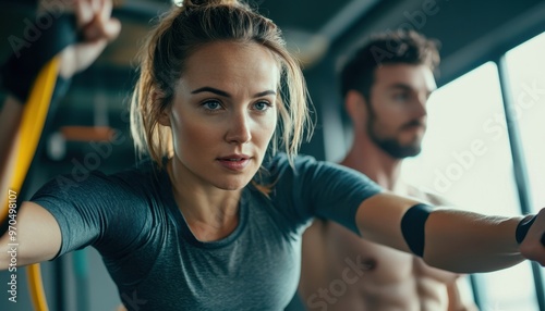© Yotwarit, Obraz premium A woman focuses on her workout during a gym class, with a man in the background.
