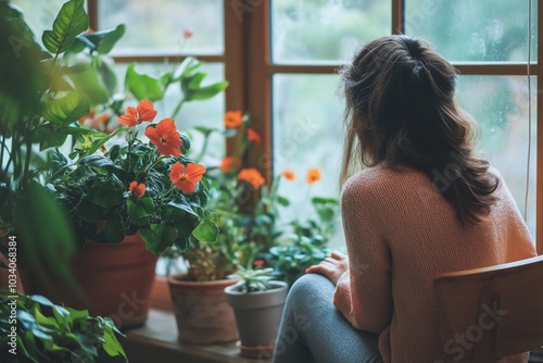 Obraz premium A woman gazes thoughtfully out a window, surrounded by vibrant indoor plants...