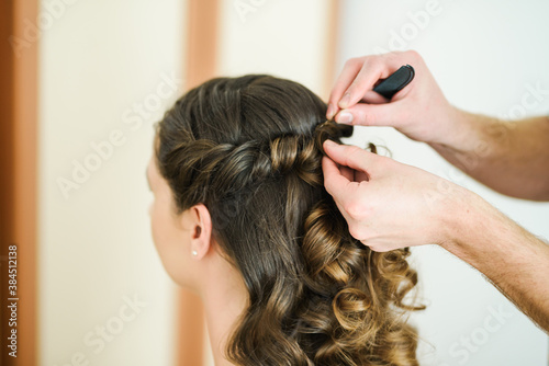 © miladrumeva, Fototapeta premium A WOMAN GETTING A HAIR DO BY A PROFFESIONAL HAIRDRESSER. CURLS MAKING