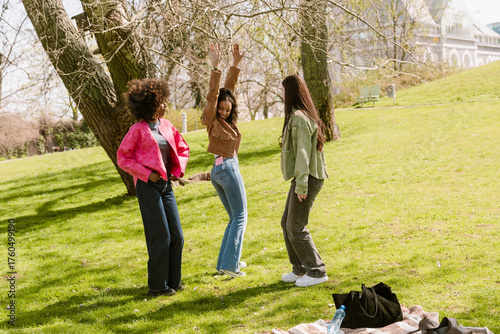 © Drobot Dean, Obraz premium A woman has her arms raised and smiles while dancing with two female friends