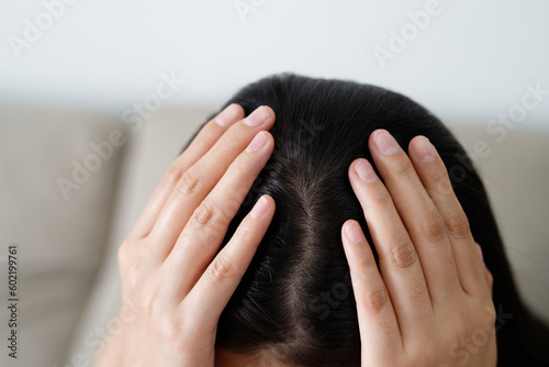 Fototapeta premium A woman has problems with hair and scalp,she has dandruff from allergic...